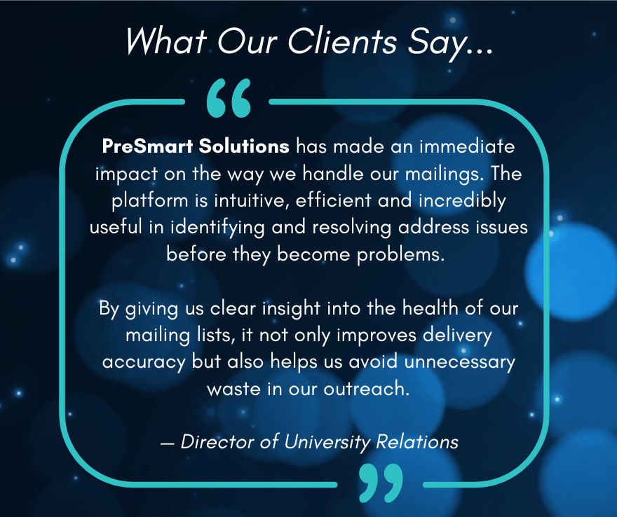 PreSmart Solutions is a web-based, self-service mail intelligence platform that gives you control and financial oversight of your direct mail campaigns by addressing the root cause of waste: undeliverable addresses.