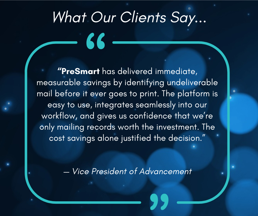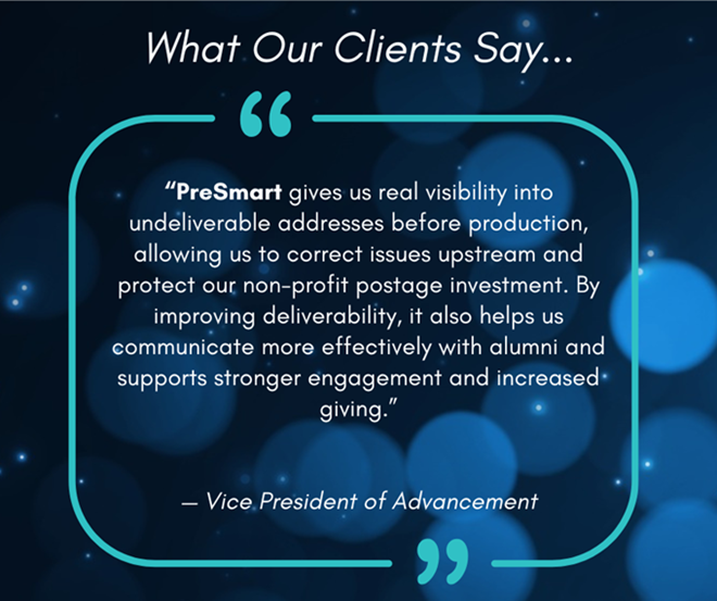 New! PreSmart’s Channel Partner Program equips mail service providers, marketing agencies, and print partners with pre-production address intelligence. Differentiate your services from vendor to strategic advisor, generate annual recurring revenue, and improve client campaign results!