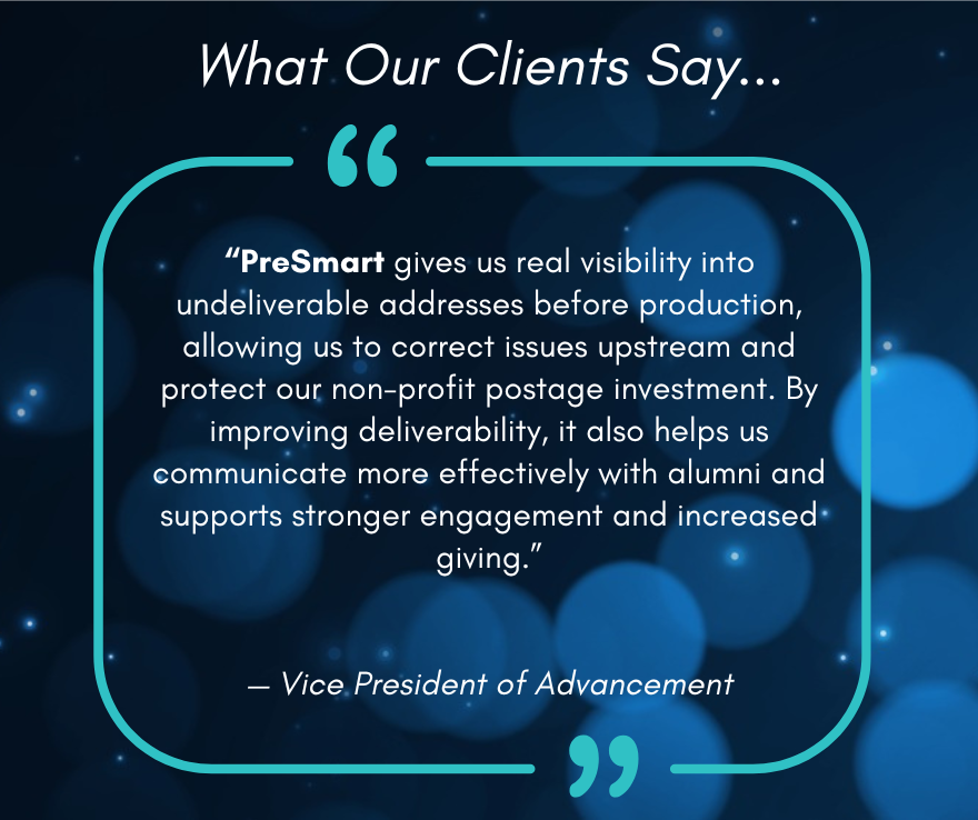 PreSmart’s advanced technology flags undeliverable and questionable addresses before mailing – even addresses that have gone through CASS and NCOA.